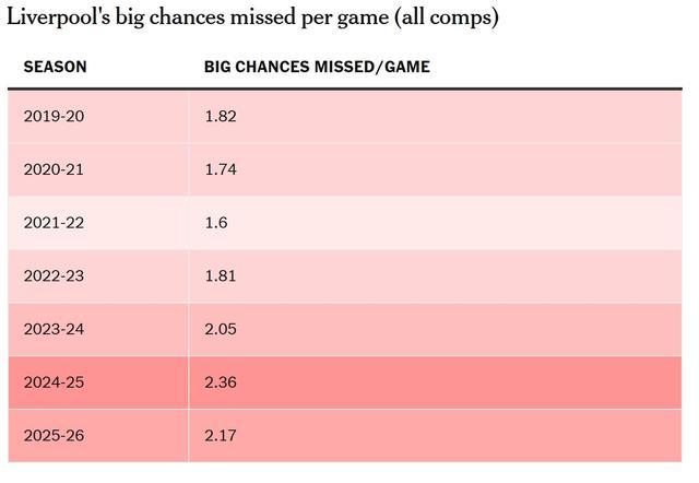 北京时间3月31日,The Athletic发表专题文章,表示利物浦本赛季已浪费102次重大机会,门前效率低下成为球队成绩下滑的关键。